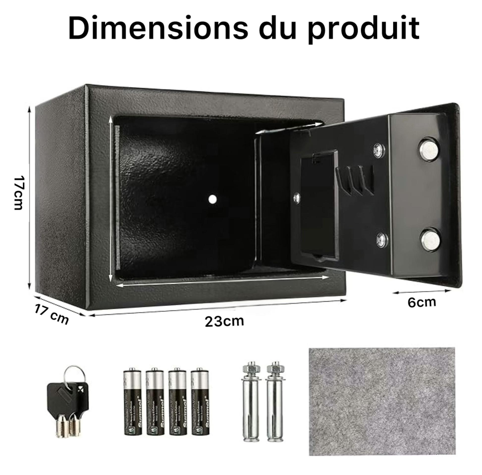 Ce mini coffre-fort électronique est la solution idéale pour garder vos objets personnels à l’abri des regards et des vols. Compact, sécurisé et facile à utiliser, il convient parfaitement à la maison, au bureau, aux hôtels ou aux commerces.